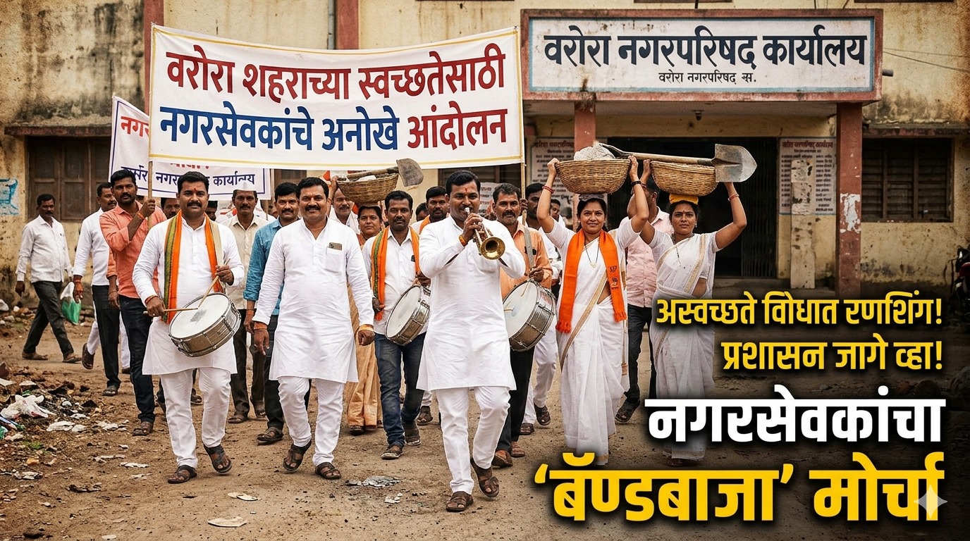 वरोरा (प्रतिनिधी): गेल्या दोन महिन्यांपासून वरोरा शहरात निर्माण झालेल्या अस्वच्छतेच्या गंभीर प्रश्नावर आणि प्रशासनाच्या ढिसाळ कारभारावर संताप व्यक्त करत, नगरसेवकांनी अनोख्या पद्धतीने आंदोलन छेडले. ‘बॅण्डबाजा’च्या गजरात, डोक्यावर घमिले आणि हातात पावडे घेऊन काढण्यात आलेल्या या मोर्चामुळे नगरपरिषद वर्तुळात मोठी खळबळ उडाली आहे.