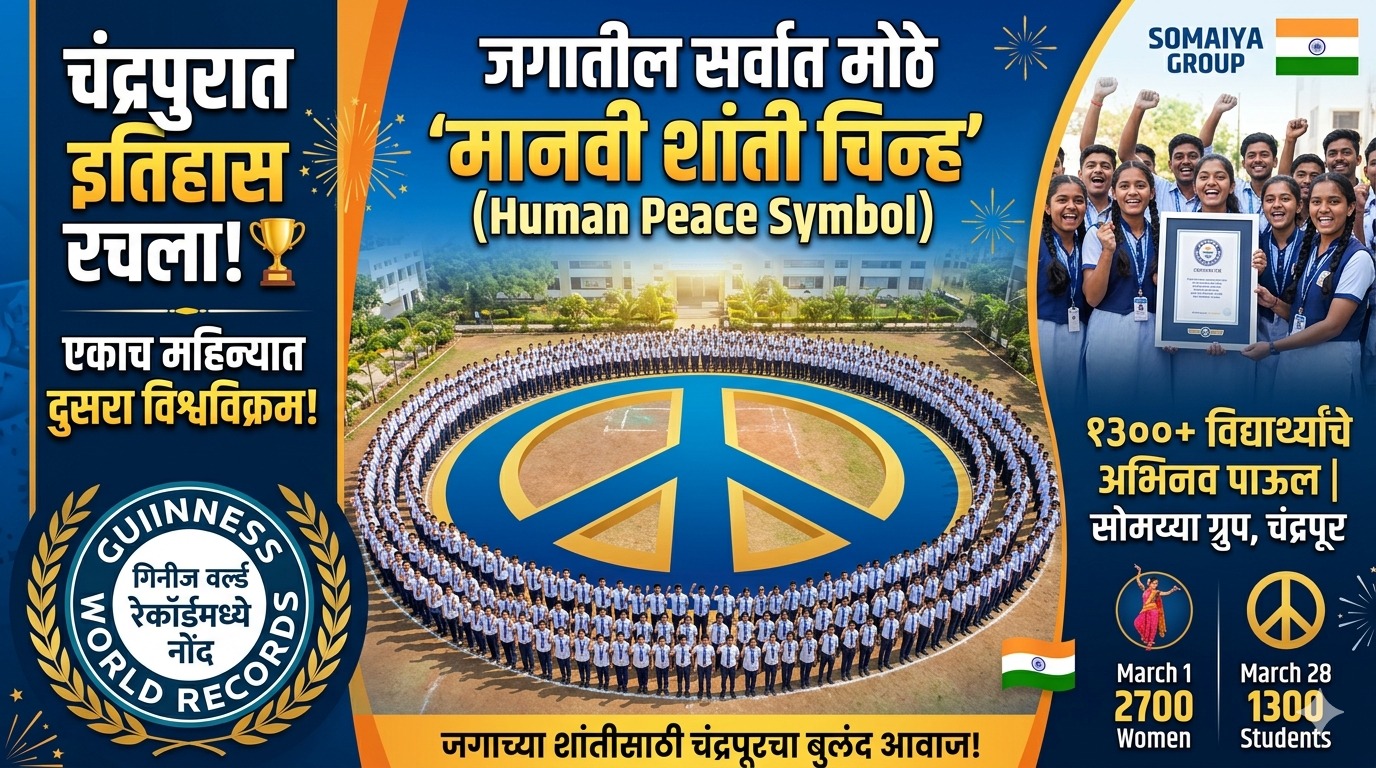 चंद्रपूर: एकीकडे जग तिसऱ्या महायुद्धाच्या उंबरठ्यावर उभे असताना आणि इराण-इस्रायलमधील वाढत्या तणावामुळे जगभरात चिंतेचे वातावरण असताना, आज चंद्रपुरातून शांततेचा एक बुलंद आवाज घुमला. येथील सोमय्या ग्रुप ऑफ इन्स्टिट्युशनच्या विद्यार्थ्यांनी एकत्र येत ‘जगातील सर्वात मोठे मानवी शांती चिन्ह’ (Human Peace Symbol) साकारून ‘गिनीज वर्ल्ड रेकॉर्ड’मध्ये आपल्या नावाची सुवर्ण अक्षरात नोंद केली आहे. विशेष म्हणजे, चंद्रपूर शहरासाठी एकाच महिन्यात नोंदवला गेलेला हा दुसरा विश्वविक्रम ठरला आहे.